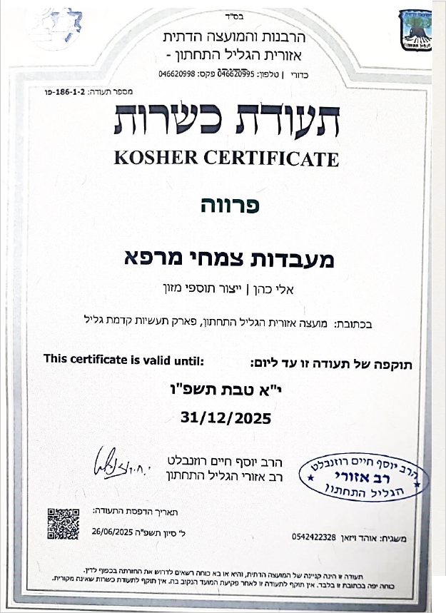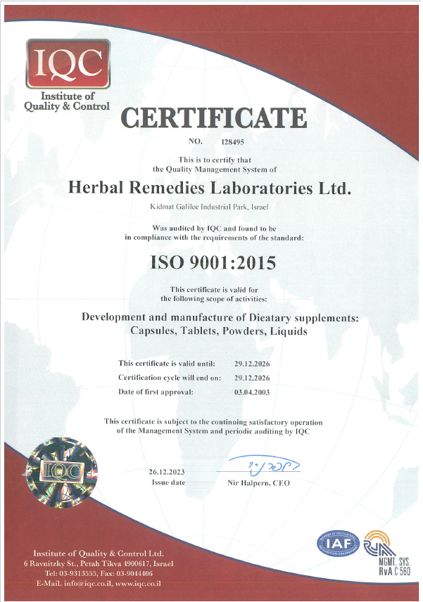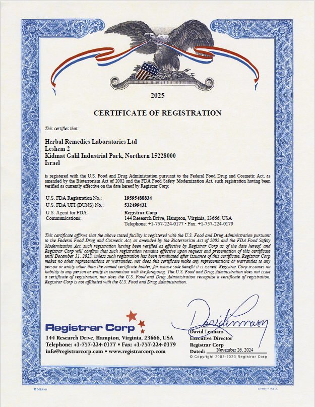 Производство одобрено Министерством Здравоохранения Израиля и имеет сертификаты GMP, Кашрут и FDA