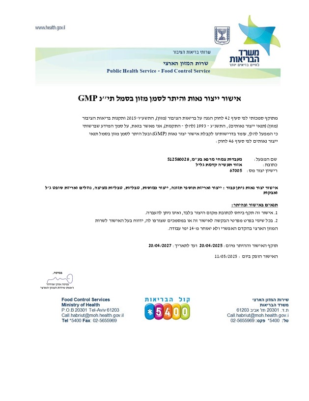 Производство одобрено Министерством Здравоохранения Израиля и имеет сертификаты GMP, Кашрут и FDA